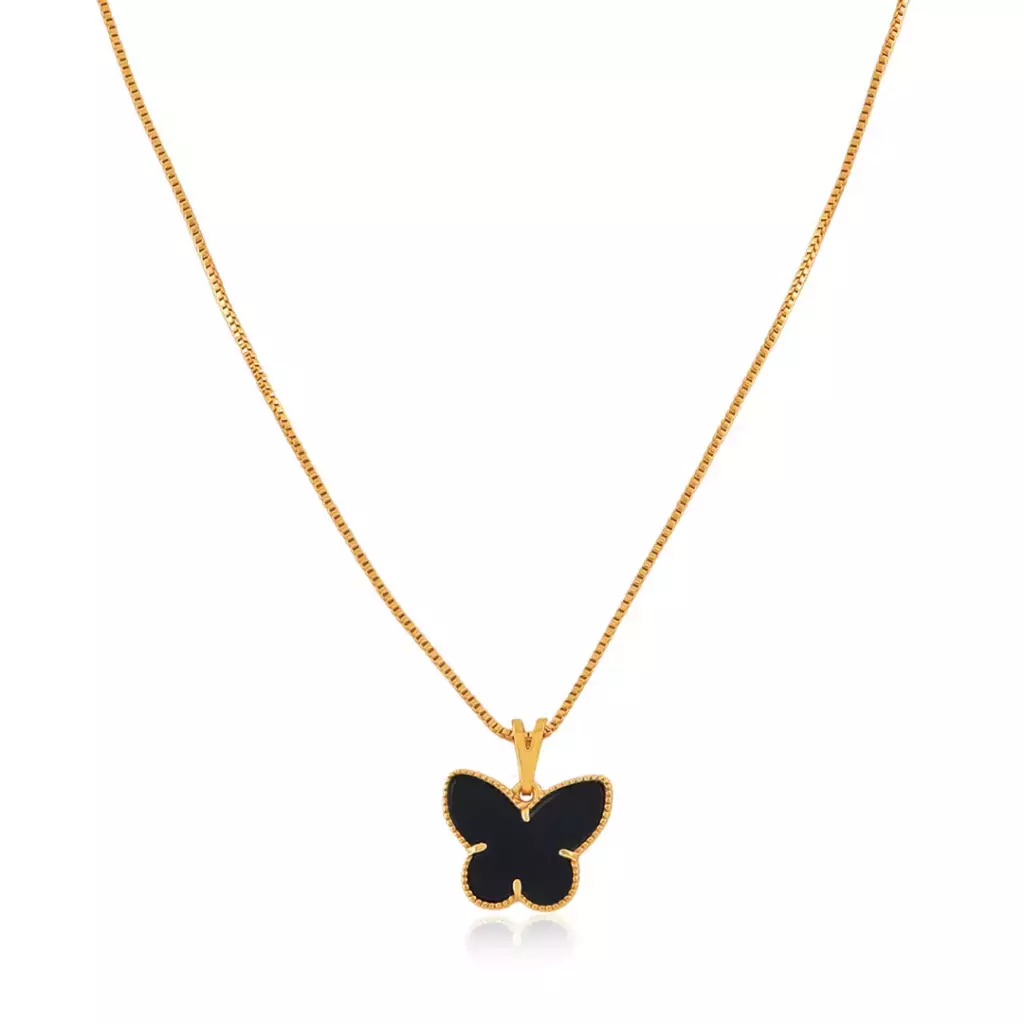 Esse colar é folheado a 3 milésimos de ouro 18K, possui dupla camada de verniz protetor, garantindo brilho intenso, alta durabilidade e resistência ao uso diário. O pingente em formato de borboleta esmaltada em preto traz elegância e personalidade, perfeito para quem ama acessórios delicados, mas marcantes.